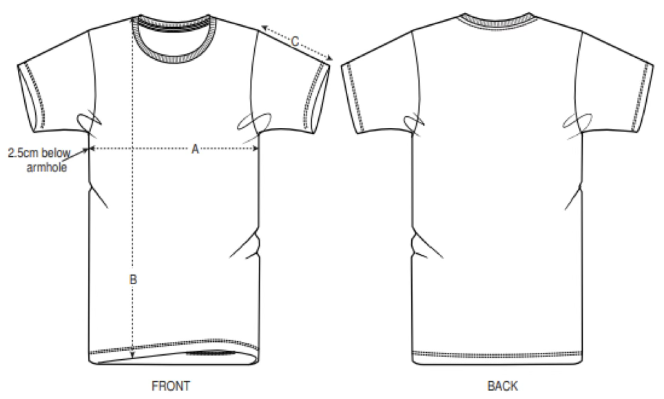 A – lătime piept măsurat la 2,5cm sub-braț, B – lungime tricou, C – lungime mânecă